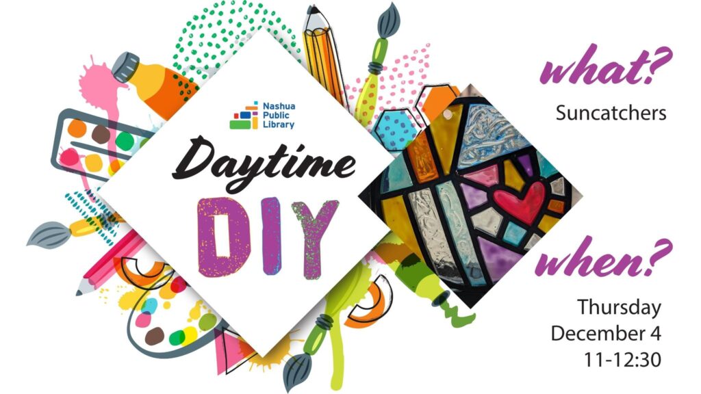 Daytime DIY: Suncatchers, Nashua Public Library, Nashua, NH โ As we edge towards the darkest days of the year, let’s catch as much light as possible by making a plexiglass suncatcher. Choose from a variety of designs or design your own. Open to adults age 18+. This event will take place on Thursday, Dec. 4 from 11 am – 12:30 pm. More info here.