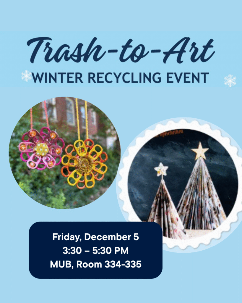 Trash-to-Art, UNH, Memorial Union Building, Manchester, NH โ Join the Sustainability Institute Zero Waste Interns to make upcycled winter-themed decorations (or thoughtful handmade gifts!) for the holiday season! Weโll reuse materials from campus academic buildings, helping to reduce waste on campus. This event will take place on Friday, Dec. 5 from 3:30 pm – 5:30 pm in the Memorial Union Building, Room 334/336. More info here.