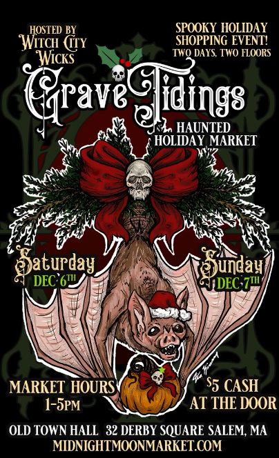 Grave Tidings Haunted Holiday Market, Old Town Hall, Downtown Salem, MA โ Grave Tidings is a spooky holiday shopping experience! Join us for a frightfully festive time on Dec. 6 & 7 at the historic Old Town Hall in the heart of Downtown Salem. Hosted by Witch City Wicks, this event features a carefully curated selection of the best dark aesthetic, gothic, witchy-themed artists and creators for one of a kind holiday gifts. General admission market hours: 1 – 5pm both days, $5 cash only at the door (proceeds will be donated to The Salem Pantry). More info here.