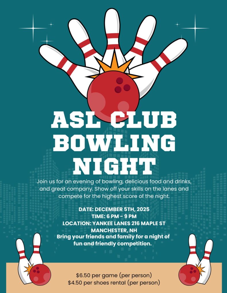 Pinkerton Academy ASL Club Bowling Night, Yankee Lanes, Manchester, NH โ Pinkerton Academy ASL Club is hosting bowling night at Yankee Lanes!!! RSVP so we can reserve lanes for this event! Cost is $6.50 per game and $4.50 for shoe rentals! Come on down and mingle in ASL! This event will take place on Friday, Dec. 5 from 6 pm – 9 pm.