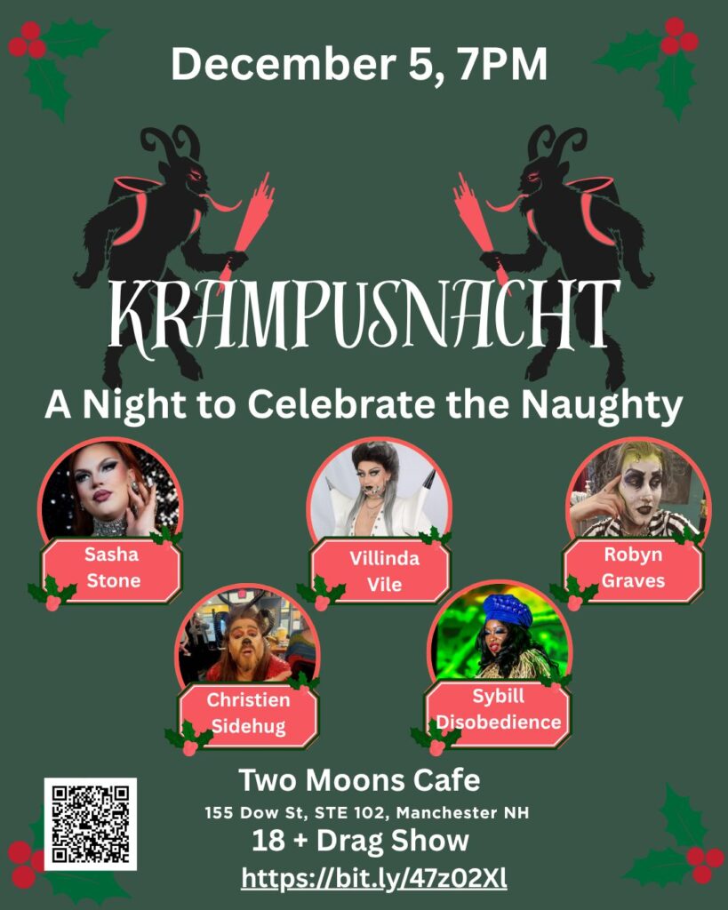 Two Moons After Dark: Krampusnacht, Two Moons Cafรฉ, Manchester, NH โ Celebrate the naughty, wicked, and kooky spirits of the holidays. Krampus, the Grinch, and all the things on the other side of the sugar plum forest. This drag show, happening at Two Moons Cafรฉ will be sure to have you gagged for the holiday season. This event will take place on Friday, Dec. 5 starting at 7 pm. Get tickets here.