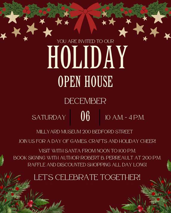 2025 Holiday Open House, Millyard Museum, Manchester, NH โ Join us on Saturday, Dec. 6 from 10 am โ 4 pm. Enjoy time spent with your neighbors, family and friends on this festive day of fun family activities and discounted shopping at the Millyard Museum! Members of the Manchester Historic Association receive an extra 10% discount this day only (at least 20% off all shop items). Enjoy childrenโs holiday crafts, cookies and cider, and old-fashioned board games. Visit with Santa Claus from noon to 1 pm! At 2 pm, attend a book signing by local author and historian Robert B. Perreault. More info here.