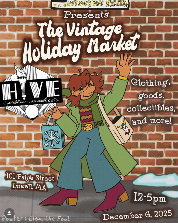 Not Your Dad’s Market Presents: The Vintage Holiday Market, Hive Public Market, Lowell, MA โ Not Your Dad’s Market hosts their first Vintage Market at Hive Public Market on Saturday, Dec. 6 from 12 pm – 5 pm. Vendors from near and far offering genuine vintage clothing, sustainable wares, and upcycled pieces. Come through!