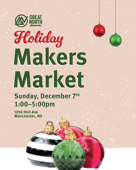 Holiday Makers Market, Great North Aleworks, Manchester, NH โ Join us Sunday, Dec. 7 from 1 pm โ 5 pm for our Holiday Makers Market! Grab a beverage, browse local artisans, and check off that to-do list. Shop small, support local!