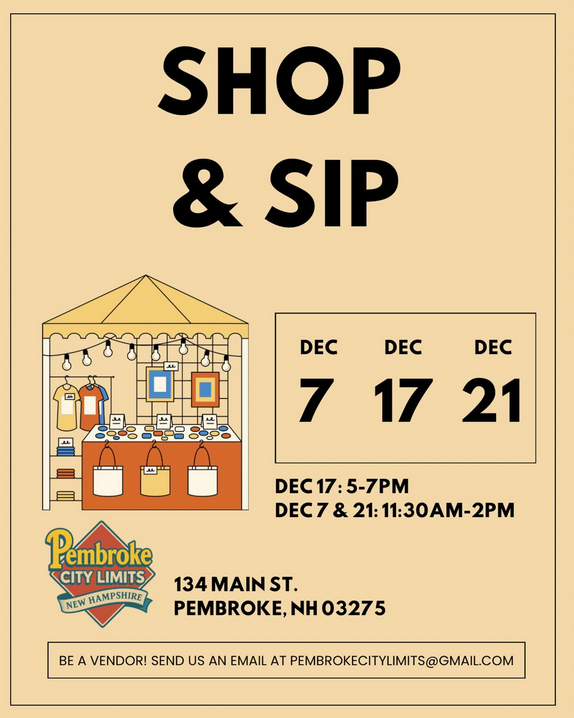 Christmas in the Village: Shop & Sip, Pembroke City Limits, Pembroke, NH โ This Sunday, Dec. 7 from 11:30 am – 2 pm, come get some of your holiday shopping in and support local vendors! We have a variety of items from vendors including: Maisy Love; J&J Designs; Young Soul Candle Making; DeCarli Woodworks.