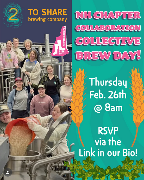 Collaboration Collective Brew Day, To Share Brewing Company, Manchester, NH โ Join the Us – the Pink Boots Society NH Chapter – at To Share Brewing for their 6th Collab. Brew Day! This event will take place on Thursday, Feb. 26, starting at 8 am. Weโll be brewing, learning, and connecting with industry folks who believe in collaboration and supporting women & non-binary individuals in the fermented beverage industry. More info here.