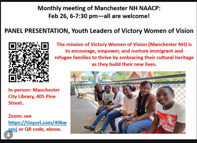 NAACP Panel Presentation: Youth Leaders of Victory Women of Vision, Manchester City Library, Manchester, NH โ Join us for the Manchester NAACP General Meeting on Thursday, Feb. 26 from 6 pm – 7:30 pm at the Manchester City Library. Weโre spotlighting Youth Leaders from Victory Women of Vision as they share how theyโre moving the needle, uplifting immigrant and refugee communities, and shaping the change they aspire to see in todayโs world. Join via Zoom here.