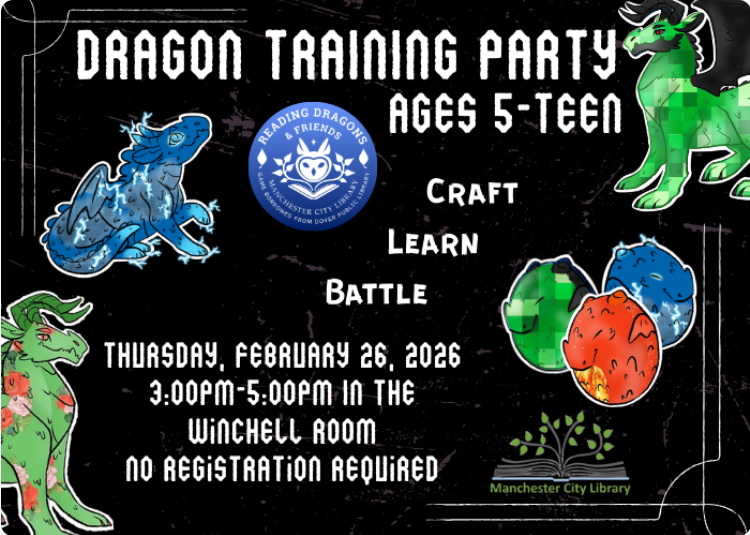 Dragon Training Party, Manchester City Library – Winchell Room, Manchester, NH โ Anyone Ages 5-Teen who wants to battle their Winter Reading Dragons & Friends, or to explore other dragon training activities and crafts can drop in at the Manchester City Library’s Winchell Room on Thursday, Feb. 26 any time between 3 pm and 5 pm. Participation in the Winter Reading Dragons & Friends program is not required for Dragon Training (except to participate in the card game-sign up for your starter set any time). For more information, please call 603-624-6550 ext. 7628. No Registration required.
