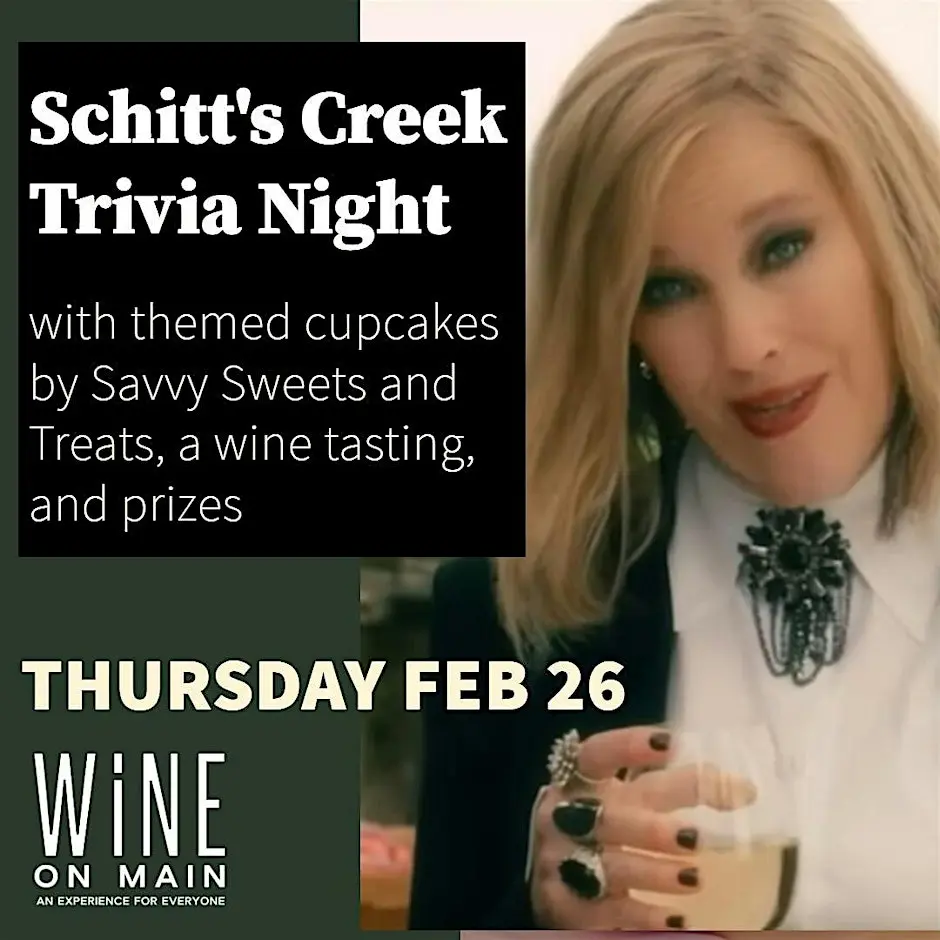 Schitt’s Creek Trivia with Savvy Sweets and Treats, Wine on Main, Concord, NH โ In honor of Catherine O’Hara, put your Schitt’s Creek knowledge to the test while enjoying themed cupcakes and a wine tasting. Win prizes! Join us this Thursday, Feb. 26 from 6:30 pm – 8 pm. More info here.