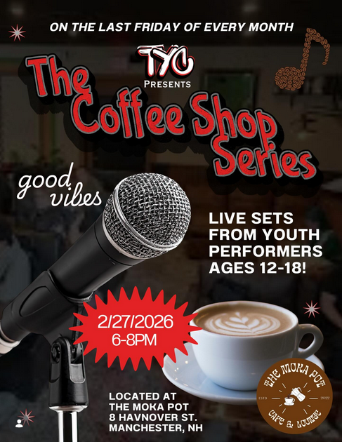 TYC Presents: The Coffee Shop Series, The Moka Pot, Manchester, NH โ Weโre so excited to kick off TYC Presents: The Coffee Shop Series, a monthly open micโstyle showcase highlighting youth performers ages 12โ18. Join us this Friday, Feb. 27 from 6 pm – 8 pm at The Moka Pot. Thereโs still time to sign up to perform. Whether you sing, rap, play an instrument, read poetry, or want to share your art, this space is for YOU. Email us at tyc.theyouthcomplex@gmail.com or sign up directly on our website. Good vibes, live youth talent, and community energy, all in one space.