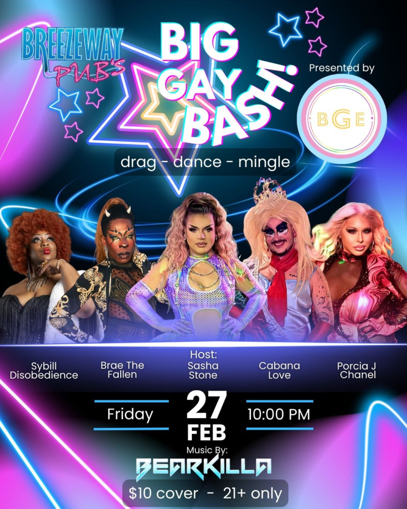 Breezeway’s Big Gay Bash!, Breezeway Pub, Manchester, NH โ Big Gay Events and The Breezeway Pub are excited to be partnering for a BGE take over on the last Friday of each month! Join us on Friday, Feb. 27 starting at 10 pm.