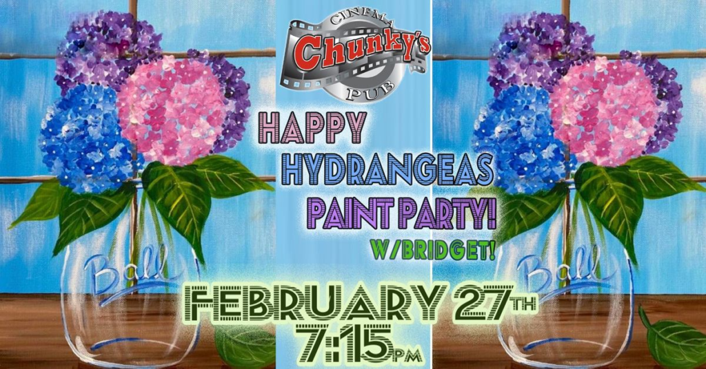 PAINT PARTY: HAPPY HYDRANGEAS!, Chunky’s Cinema Pub, Manchester, NH โ Bridget is back at Chunky’s and she is utilizing our SPACIOUS lobby & bar (or theater) to guide you through a full size painting! Tickets are only $45 and there are limited seats available. The bar is open through the entirety of the event for classic crafted cocktails! Area is open 1 hour before the painting starts to order dinner and drinks! This event will take place on Friday, Feb. 27 at 7:15 pm. Reserve your spot here.