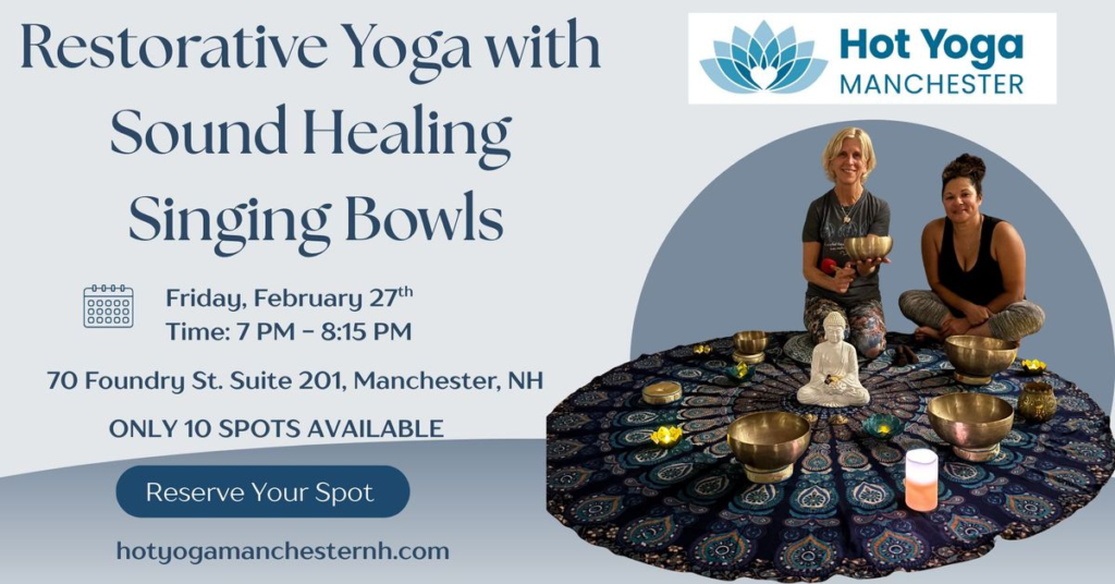 Restorative Yoga ~ Sound Healing Singing Bowls Meditation, Hot Yoga Manchester, Manchester, NH โ Join Jada for a deeply nourishing Restorative Yoga session, enhanced by the calming sounds of Singing Bowls with Lusann. This special event features gentle, prop-supported postures that promote profound relaxation, paired with the healing resonance of sound meditation to quiet the mind, reduce stress, and restore balance. These classes will take place on Friday, Feb. 27 at 7 pm and 8:15 pm. Get tickets here.