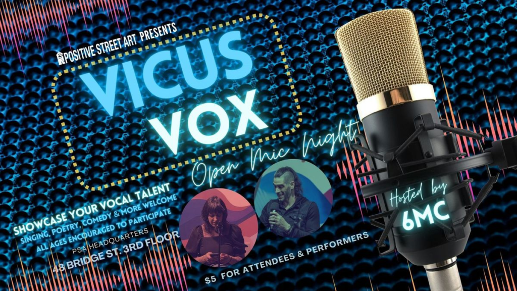 VICUS VOX – Open Mic Night, Positive Street Art, Nashua, NH โ Join us for our Open Mic Series, “VICUS VOX” (Latin for “Voice of the City”), where participants showcase their vocal talents with the community! Signups are on a first come, first serve basis. Content must be friendly for all ages. This event will take place on Friday, Feb. 27 starting at 7 pm. More info here.