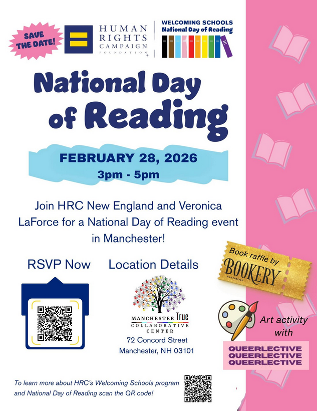 National Day of Reading Event, Manchester True Collaborative Center (YWCA), Manchester, NH โ Save the date! Join Human Rights Campaign New England and Veronica LaForce at the Manchester True Collaborative Center located in the YWCA at 72 Concord Street for the National Day of Reading Event. This free event will take place on Saturday, Feb. 28 from 3 pm – 5 pm. RSVP here.