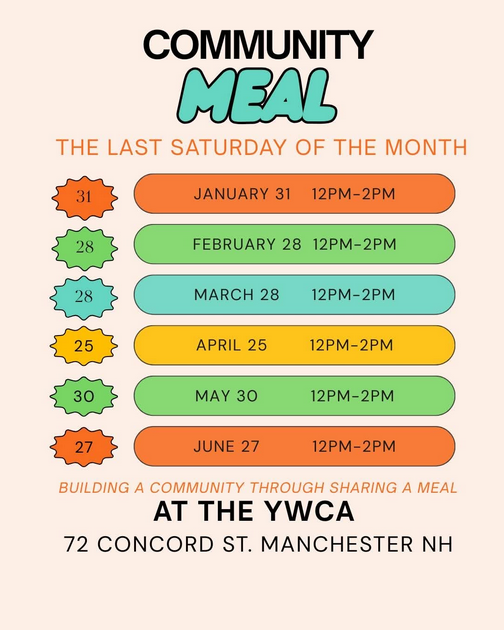 Community Meal, YWCA, Manchester, NH โ Held on the last Saturday of each month, our Community Meal is a free, welcoming space to come together, share a meal, and build connection with neighbors. Join us for the next one on Saturday, Feb. 28 from 12 pm – 2 pm at the YWCA located at 72 Concord St. Everyone is welcome. No registration required just come as you are.