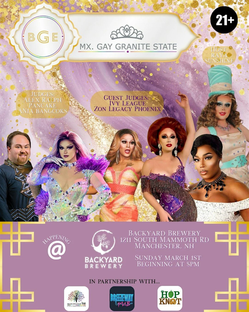 Mx. Gay Granite State, Backyard Brewery and Kitchen, Manchester, NH โ The Third Annual Mx. Gay Granite State pageant is back! This year 13 contestants will compete for the crown to represent the Granite State! This event will take place on Sunday, March 1 at 5 pm. Get tickets here.