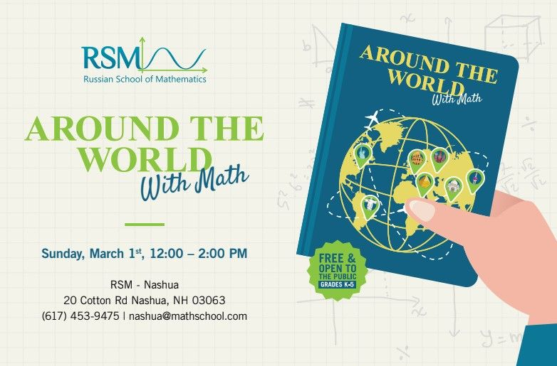 Around The World with Math, Russian School of Mathematics, Nashua, NH โ Explore the world through fun, hands-on math games and challenges inspired by different countries. Interactive. Playful. Perfect for curious kids. This event will take place on Sunday, March 1 from 12 – 2 pm at the Russian School of Mathematics โ Nashua. It’s FREE & open to the public. Grades Kโ5. Come travel the world with math. More info here.