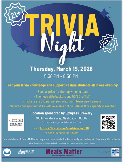 Meals Matter Trivia Night, Spyglass Brewery, Nashua, NH โ€“ Attention Trivia Fans! Our Meals Matter program is hosting a trivia night on March 19 to help raise fund to support their program. Meals Matter is a program that works to eliminate food insecurity for the student in our school district. They provided needed financial assistance to families across the district. Donโ€™t miss your chance for a fun night to support a great cause! This event will take place on Thursday, March 19 from 5:30 pm – 8:30 pm. Get tickets here.