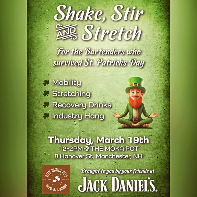 Shake, Stir, and Stretch, The Moka Pot, Manchester, NH โ€“ Getting Ready For the Mayhem This Week? Need to Recharge After the Chaos? We’re Inviting All Our Service Workers Who Need to Get STRETCHED OUT This Thursday the 19th! Come on into the Moka Pot, Have a Tea and Relax with Us! Get Stretched! You know you wanna….Decompress and Hang Out this Thursday, March 19 from 12 pm – 2 pm!