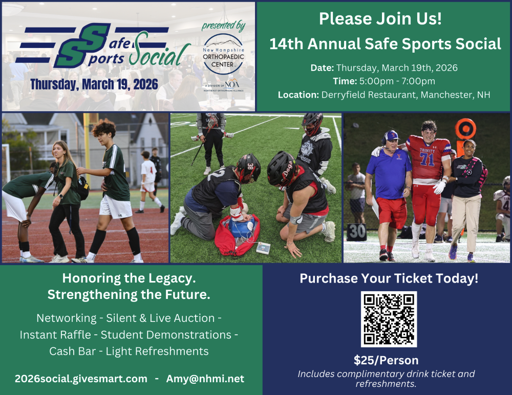 14th Annual Safe Sports Social, The Derryfield Restaurant, Manchester, NH โ€“ Join us on Thursday, March 19 from 5 pm – 7 pm at the Derryfield for an evening focused on connection, community, and protecting the health and safety of local student athletes. The Safe Sports Social is a community event to benefit Greater Manchester youth and bring people together who believe that sports have many important physical, social and emotional benefits for kids. This event will take place on Thursday, March 19 from 5 pm – 7 pm. More info here.