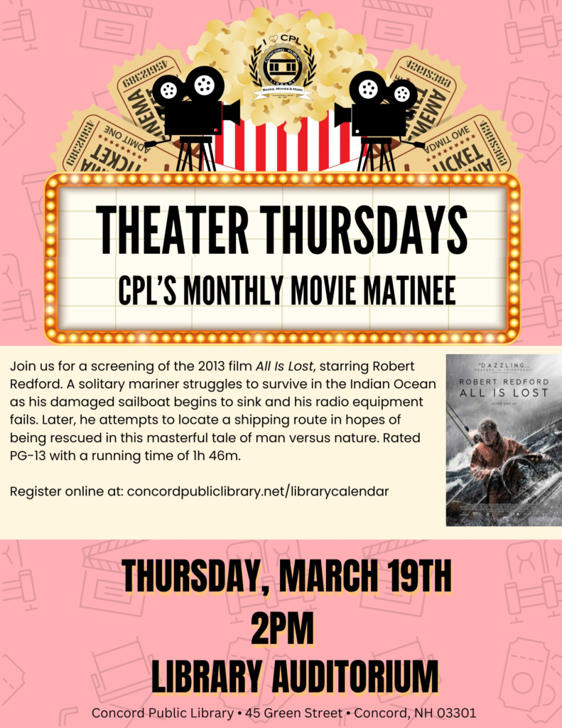 Theater Thursday: All is Lost, Concord Public Library Auditorium, Concord, NH โ€“ Join us for a screening of the 2013 film All Is Lost, starring Robert Redford. A solitary mariner struggles to survive in the Indian Ocean as his damaged sailboat begins to sink and his radio equipment fails. Later, he attempts to locate a shipping route in hopes of being rescued in this masterful tale of man versus nature. Rated PG-13 with a running time of 1h 46m. This movie showing will take place on Thursday, March 19 from 2 pm – 4 pm.