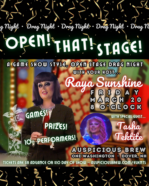 Open! That! Stage! Drag Night, Auspicious Brew, Dover, NH โ€“ This event comes around every other month, and itโ€™s YOUR opportunity to get onstage and show your stuff!! An open stage drag show inspired by game shows with fun games and frivolous prizes. March’s special guest is TASHA TEKTITE! Wanna get onstage and perform at the next Open! That! Stage!?!?!?! Keep your eyes peeled for the next time Raya opens her sign-up form. Follow @rayasunshineomg so you don’t miss a beat! This event will take place on Friday, March 20 starting at 8 pm. Tickets are $8 advance or $10 day of show. Get tickets here.