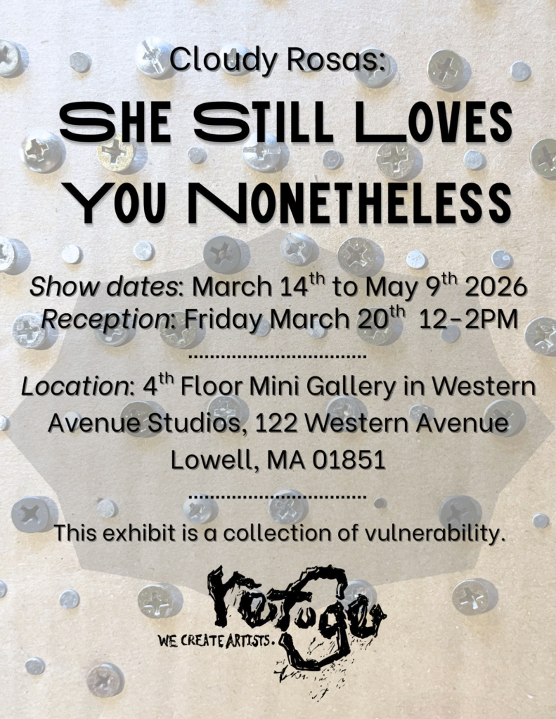 She Still Loves You Nonetheless | By Cloudy Rosas | 4th Floor Mini Gallery Reception, Taffeta, Lowell, MA โ€“ When uncomfortable feelings emerge, Cloudyโ€™s response is to compartmentalize, to break down old cardboard boxes, stitch found objects to them, and assemble them into small buildings. Through this she thinks about loneliness, depression, nature, dreams, and spirituality. There is healing the deeper we go, slowly coming back up towards learning to overcome. This exhibit is a collection of vulnerability. This will be open to the public March 14 โ€“ May 9. Join us for a reception on Friday, March 20 from 12 pm โ€“ 2 pm.