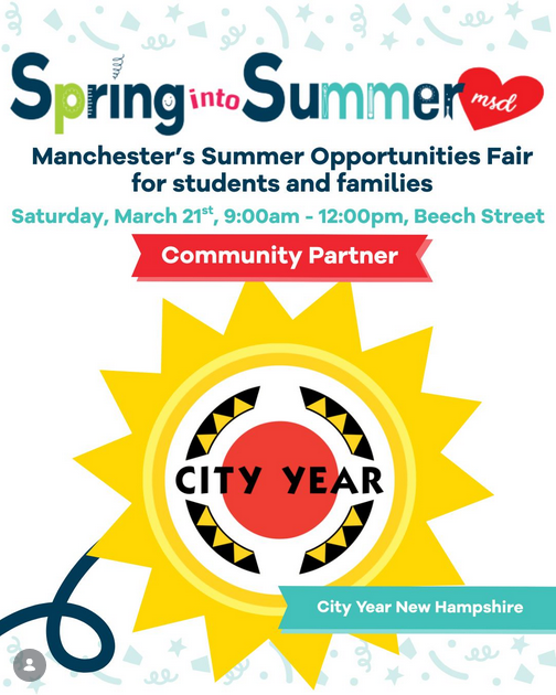 City Year’s Spring Into Summer Resource Fair, 333 Beech St, Manchester, NH โ€“ This free community event brings together local organizations offering enriching summer activities, career-connected learning programs, and youth job opportunities. This resource fair will take place on Saturday, March 21 from 9 am – 12 pm. More info here.