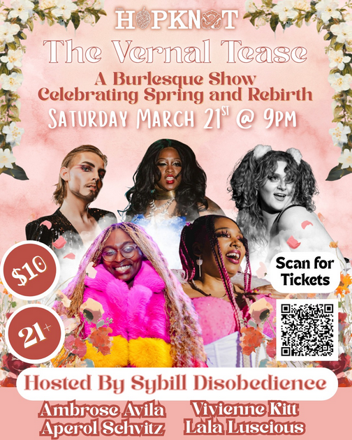 The Vernal Tease: A Burlesque Show Celebrating Spring and Rebirth, The Hop Knot, Manchester, NH โ€“ We are doing our first ever Burlesque Show! The Vernal Tease is a burlesque show celebrating Spring and Rebirth! Sybill Disobedience will be hosting the night and will be joined by a stunning and sensual cast of amazing Burlesque talent! Enjoy performances from Ambrose Avila, Aperol Schvitz, Vivenne Kitt and Lala Luscious! This event is 21+ with a $10 ticket! There are limited seats available for this show so DON’T WAIT to grab yours! This event will take place on Saturday, March 21 starting at 9 pm. Get tickets here.