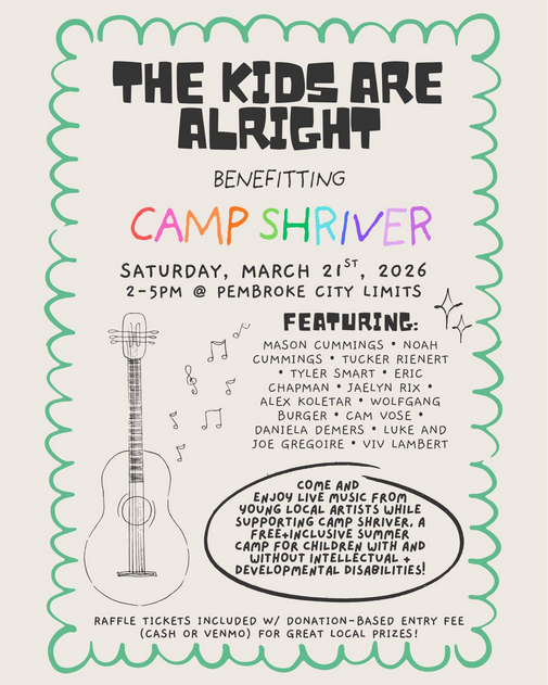 The Kids Are Alright, Pembroke City Limits, Suncook, NH โ€“ Come and enjoy live music from young local artists while supporting Camp Shriver, a free and inclusive summer camp for children with and without intellectual and developmental disabilities! Raffle tickets included with donation-based entry fee (cash or Venmo) for great local prizes! This event will take place on Saturday, March 21 from 2 pm – 5 pm at Pembroke City Limits.
