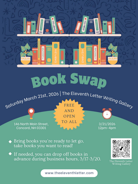 Book Swap, The Eleventh Letter Writing Gallery, Concord, NH โ€“ Looking to make room on your shelves and reading lists? Weโ€™re having a book swap this Saturday, March 21 from 12 pm – 4 pm! Bring books youโ€™re ready to part with and take new ones! Itโ€™s FREE! (Can drop off books in advance if youโ€™d like, starting 17 March.)