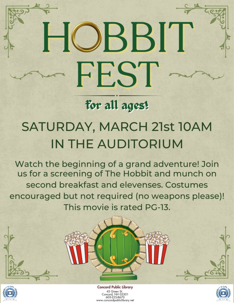 Hobbit Fest, Concord Public Library, Concord, NH โ€“ Watch the beginning of a grand adventure! Join us for a screening of The Hobbit and munch on second breakfast and elevenses. Costumes encouraged but not required (no weapons, please)! This movie is rated PG-13. (Program for all ages). This event will take place on Saturday, March 21 from 10 am – 1 pm. More info here.