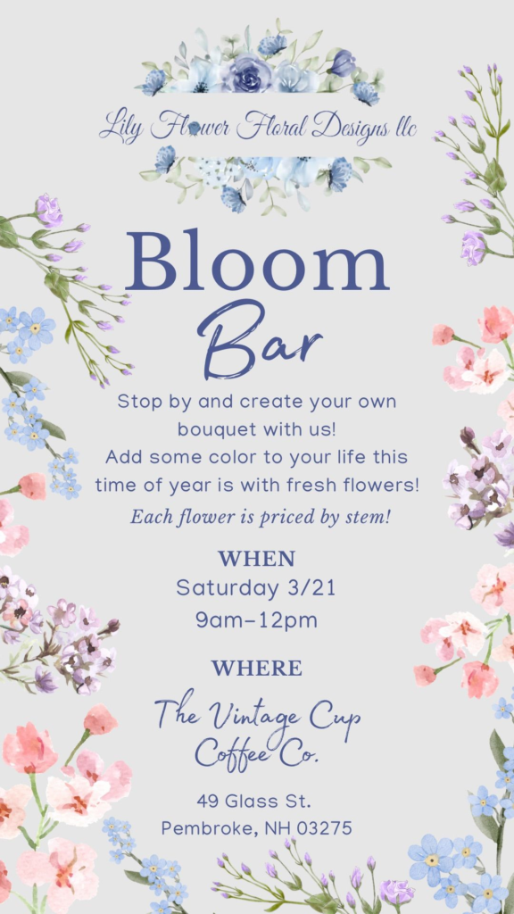 Bloom Bar, The Vintage Cup Coffee Co., Pembroke, NH โ€“ Join Lily Flower Floral Designs for a creative and inspiring morning at Vintage Cup Coffee Co.! Design and build your own wrapped bouquet using a beautiful selection of colorful blooms. Whether you come with friends, family, or on your own, this make your own bouquet experience is open to everyone and perfect for welcoming the season! This event will take place on Saturday, March 21 from 9 am – 12 pm. More info here.