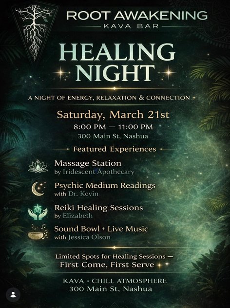 Healing Night, Root Awakening Kava Bar, Nashua, NH โ€“ Join us for Healing Night at Root Awakening this Saturday, March 21 from 8 pm โ€“ 11 pm. Unwind, reset, and reconnect. Join us for a night of sound healing, good energy, and kava. 300 Main St. Nashua NH. No entry fee.
