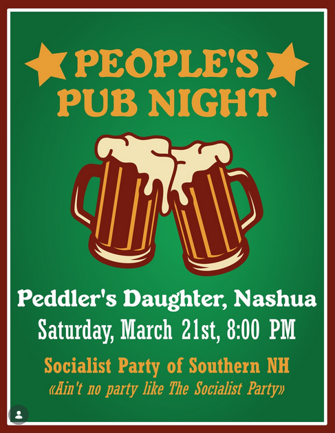 People’s Pub Night, Peddler’s Daughter, Nashua, NH โ€“ Another People’s Pub Night is coming right up! Come meet the Party at The Peddler’s Daughter pub in Nashua – discuss how you can get involved over some drinks! This event will take place on Saturday, March 21 at 8 pm.