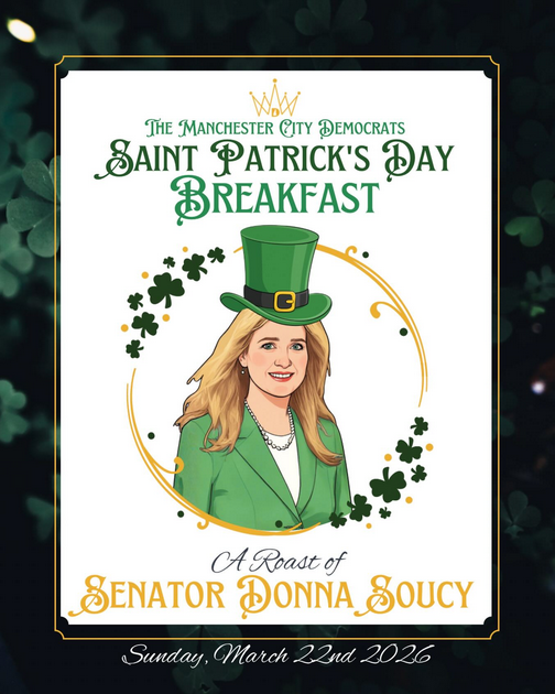 The Manchester City Democrats Saint Patrick’s Day Breakfast, Rex Theatre, Manchester, NH โ€“ This yearโ€™s Manchester City Democratsโ€™ St. Patrickโ€™s Day Breakfast will honor Senator Donna Soucy, a longtime champion for Manchester and the Granite State. For one morning only, sheโ€™ll also take a turn in the hot seat during our famous breakfast roast. This event will take place on Sunday, March 22 at 9 am at the Rex Theatre. Come celebrate and share a few laughs with us. Get tickets here.