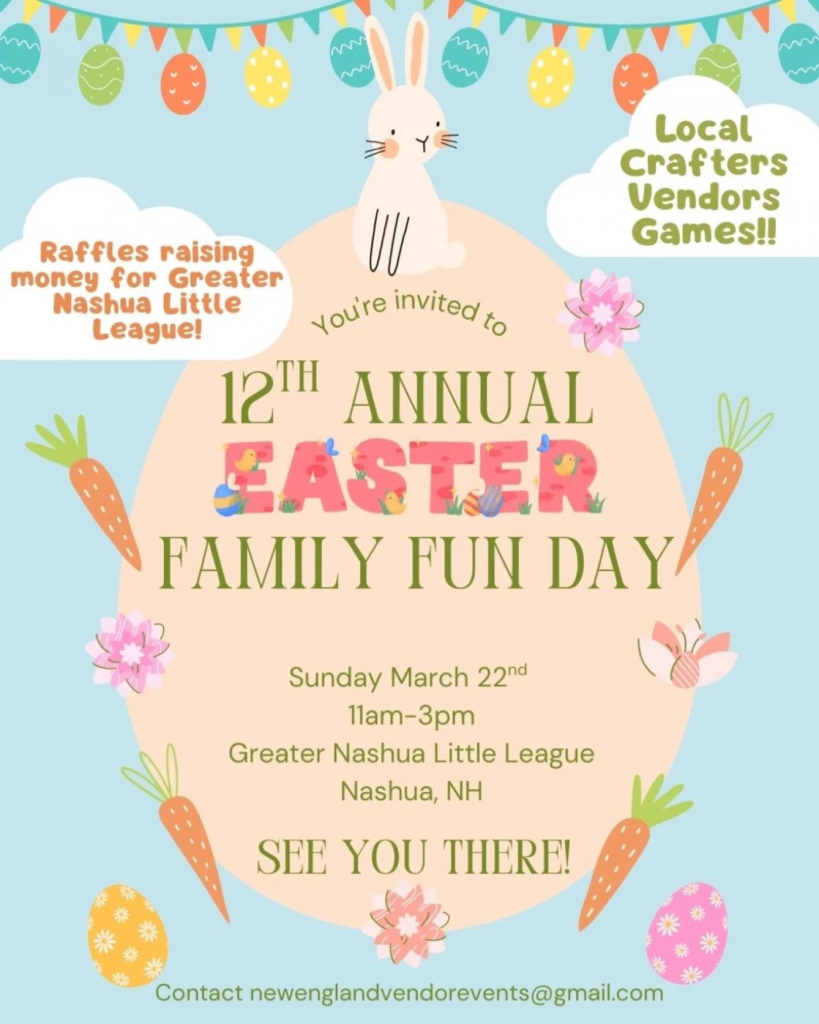 Nashua 12th Annual Easter Family Fun Day, Broad Street Elementary School, Nashua, NH โ€“ Hop on over for a day packed with egg-citing activities! Join us in person to celebrate the season with games, local vendors, photos with the Easter bunny and an epic egg hunt. Bring your smiles and get ready for some family fun that you won’t want to miss! This event will take place on Sunday, March 22 from 11 am – 3 pm. Get tickets here.