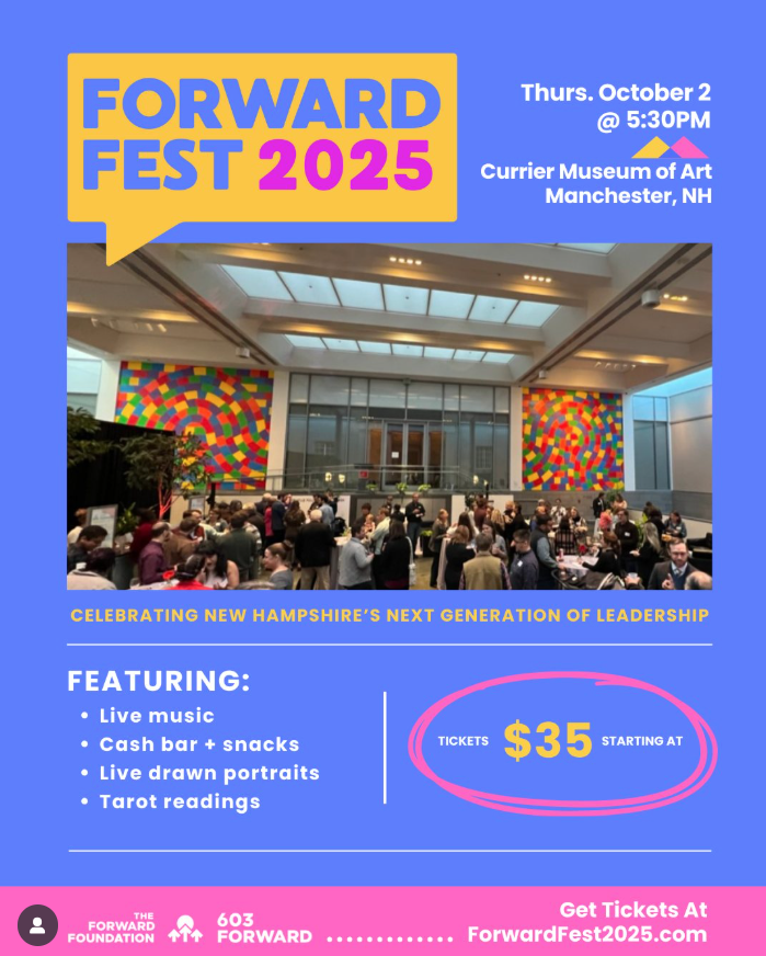 Forward Fest 2025, The Currier Museum of Art, Manchester, NH โ Forward Fest is an annual celebration of the changemakers and leaders who are making local difference in their communities. While what’s happening nationally and around the world can feel distant and too big for impact, local leaders are showing up right here in NH to make change. This event will take place on Thursday, October 2, at 5:30 pm at The Currier Museum of Art.