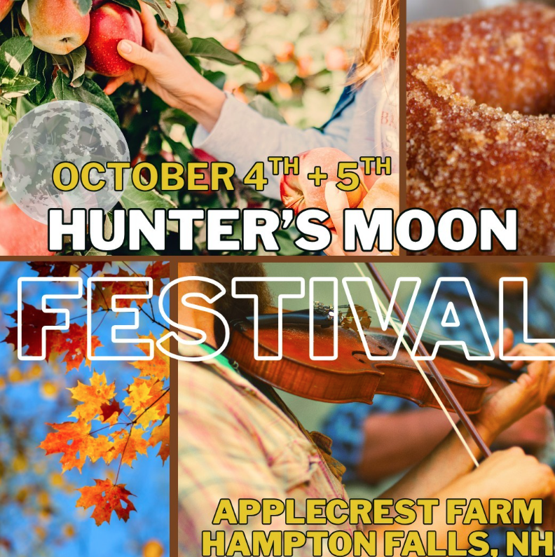 Hunter’s Moon Festival, Applecrest Farm, Hampton Falls, NH โ Applecrest’s fall harvest season continues this weekend with our Hunter’s Moon Festival! Pick-Your-Own APPLES including Macintosh, Cortland, Empire, Macoun, Red Delicious & Honeycrisp plus over 15 varieties available in the market. Pick-Your-Own Pumpkins & Raspberries too! We look forward to you joining us here at Applecrest Farm Orchards for a fun-filled fall family day! Enjoy the corn maze, barnyard animals, hot apple cider donuts, corn roast & grill. Satisfy your sweet tooth with ice cream treats from the creamery and scratch made goodies from our in-house bakery! Farm Market hours: 8 am – 6pm; PYO hours: 9am – 6pm; Creamery hours: 12 pm – 6 pm; FREE Live bluegrass music: 1 pm – 5 pm.
