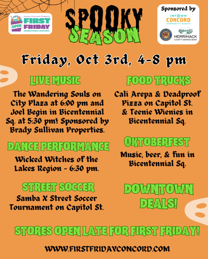 Spooky Season, Downtown Concord, NH โ Join us in downtown Concord on October 3 from 4-8 pm to enjoy live music, food trucks, and shopping! Weโre also excited to announce a brand new Oktoberfest celebration in Bicentennial Square. Enjoy an outdoor beer garden and live music – plus German-inspired food and fun! To learn more about what we have planned for next week, visit our website: firstfridayconcord.com/october.