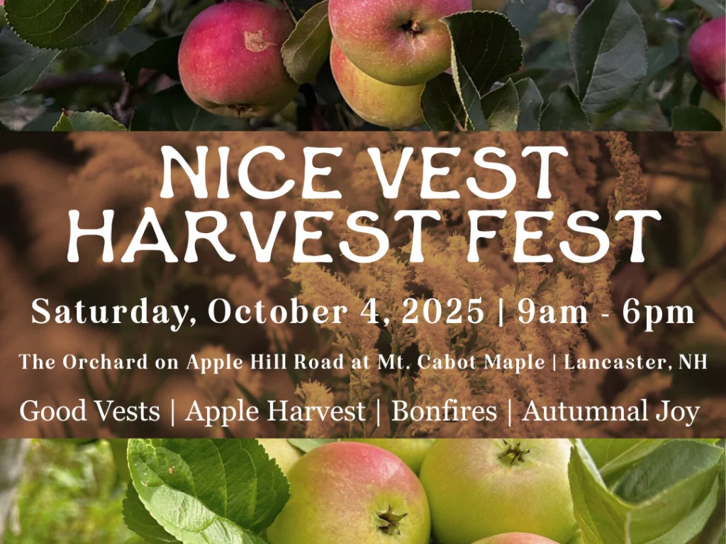 Nice Vest Harvest Fest 2025, The Orchard on Apple Hill Road at Mt. Cabot Maple, Lancaster, NH โJoin the NH Queer Farmer Network, NOK Team & Mount Cabot Maple folx for a community apple harvest with cute vests to boot! Our friends at NOK will transform these gorgeous, funky heirlooms into inspired hard ciders and apple wines that are a true taste of NH. Get your best vest on (or grab some scissors to make one), dress for the weather, and join us for a fun harvest celebration up north! Expect a day of apple picking, and lots of crawling around in the grass to collect drops. There will be bonfires and delicious food too! Options to camp with tents, hammocks, and cars. The fest will take place this Saturday, October 4 from 9 am – 6 pm.