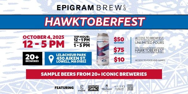 Hawktoberfest, Edward A. LeLacheur Park, Lowell, MA โ Raise a stein and celebrate fall at Hawktoberfest 2025! This one-day beer festival is taking over LeLacheur Park in Lowell with craft beer, food, live music, and plenty of Oktoberfest cheer. Sample beers from 20+ breweries. Live music on the main stage all afternoon, food vendors serving Oktoberfest style eats and local favorites, stein-holding contests, games, and more. This festival will take place on Saturday, October 4 from 1 pm – 5 pm.
