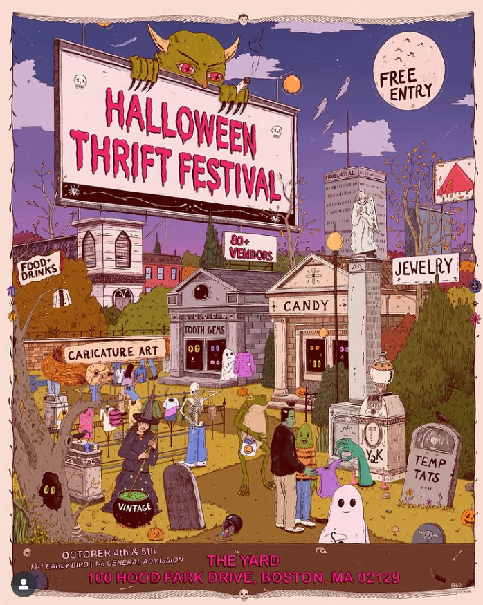 Halloween Thrift Festival, The Yard Charlestown, Boston, MA โ Weโre back and better bringing you a huge two-day HALLOWEEN THRIFT FESTIVAL at The Yard Charlestown. Shop 50k sq ft and 80+ Vintage, Y2K, Jewelry, and Local Brand Vendors. The festival also offers mini golf, fill-a-bag station, giveaways, 21+ areas, tooth gems, and so much more, all at the cityโs newest park just off the Orange Line. The festival will take place on Saturday and Sunday, Oct. 4 & 5, from 12 pm – 1 pm for Early Bird ticket holders and 1 pm – 6 pm for General Admission.