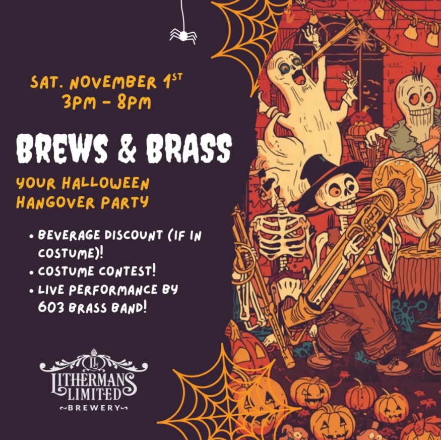 Brews & Brass: Your Halloween Hangover Party, Lithermans Limited Brewery, Concord, NH โ The Halloween Hangover party is ON! Join us for Brews & Brass, our post Trick-or-Treat festivities! Featuring 603 Brass Band, join us as we give Halloween 2025 one last hurrah! Grab your costume (or maybe what’s left of it) this Saturday, Nov. 1 from 3 pm – 8 pm, and come celebrate the season with fresh brews, sweet tunes, and good looks! Costume contest(s), candy, and the shiny brass hitting it off to get your bones moving! No cover! Free entertainment! Beverages available (beer, NA beer, and non-alcoholic available)! Cheers!
