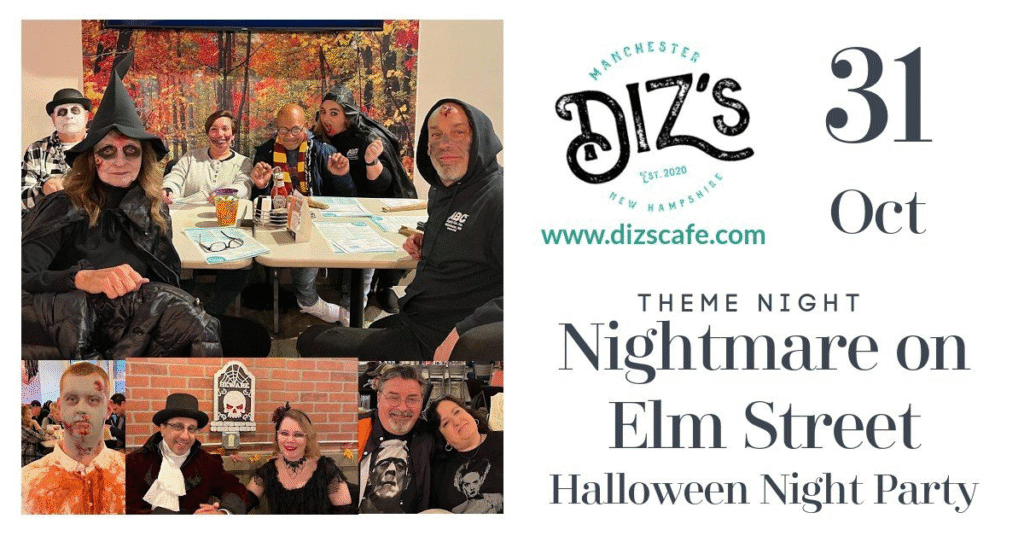 Nightmare on (the real) Elm Street, Diz’s Cafe, Manchester, NH โ Get ready for a spooky night of fun, food, and drinks! Enjoy our Halloween-themed decorations and spin the wheel for a prize if you come in costume. Good times, great eats, and lots of Halloween spiritโsee you there! This event will take place on Friday, Oct. 31 from 4-9 pm.