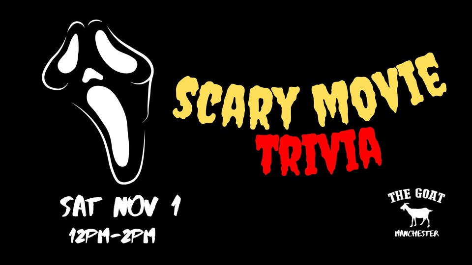 Scary Movie & Halloween Trivia, The Goat, Manchester, NH โ Get your scream team together! Scary Movie & Halloween Trivia hits The Goat Manchester this Saturday, Nov. 1 from 12โ2 pm! Free to play, no reservations needed โ just bring your spooky smarts.
