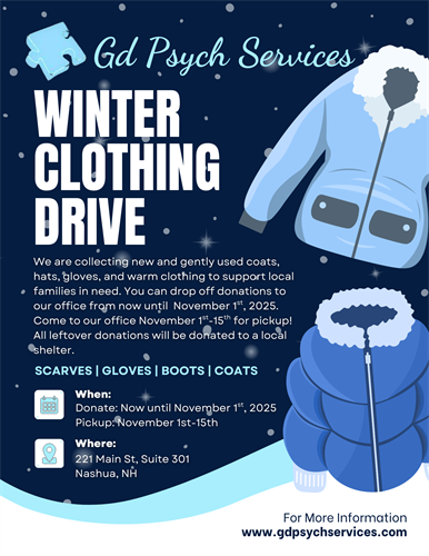 GD Psych Services Winter Clothing Drive, 221 Main St, Suite 301 Nashua, NH โ Join us in giving back this winter! Weโre hosting a Winter Clothing Drive to support local community members who need help staying warm during the colder months. From now until November 1 weโre accepting new or gently used winter essentials including coats, hats, gloves, and scarves. You can pick up donations from November 1-15 during business hours. Any left over clothing items will be donated to local shelters! You can drop off your donations at our Nashua office located at 221 Main St, Suite 301 Nashua, NH. Let’s make this season a little brighter for someone in need.