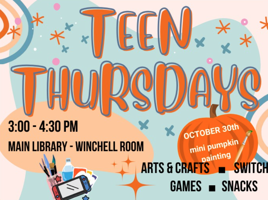 Teen Thursdays, Manchester City Library, Manchester, NH โ Every Thursday is Teen Thursday at the Manchester City Library! Join us after school in the Winchell room, anytime between 3 – 4:30 pm. This Thursday, Oct. 30 from 3-4:30 pm, we will be painting mini pumpkins! As usual we will also have snacks, video games, card and board games, and art supplies out for you to use. We hope to see you here soon!