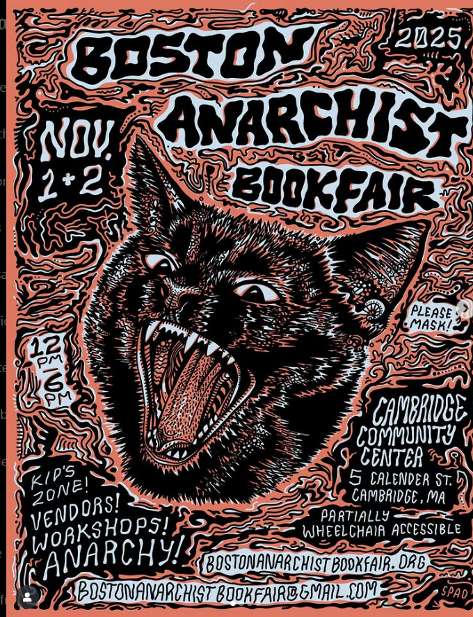 Boston Anarchist Bookfair, Cambridge Community Center, Boston, MA โ The Boston Anarchist Bookfair is back on Nov 1-2 at the Cambridge Community Center, where weโre hosting a bookfair celebrating anarchism and itโs many forms. Authors, publishers, organizers, punks, queers, abolitionists, and accomplices of all kinds โ come through for one of the longest-running anarchist bookfairs on the East Coast. The bookfair will take place on Saturday, Nov. 1 from 12 pm โ 6 pm and Sunday, Nov. 2 from 12 pm โ 5 pm. Feel free to contact us with any inquiries or to express interest in participating at bostonanarchistbookfair@gmail.com. We are looking forward to it!
